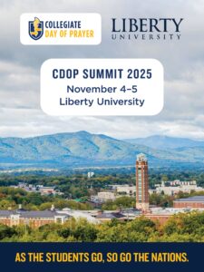 Join collegiate and next-gen movement leaders from across America for the Collegiate Day of Prayer National Summit. A 24 hour gathering for sharing the vision of the Collegiate Day of Prayer 2026 at Liberty University and a moment to strategize and mobilize churches and ministries to adopt every college in America in prayer.